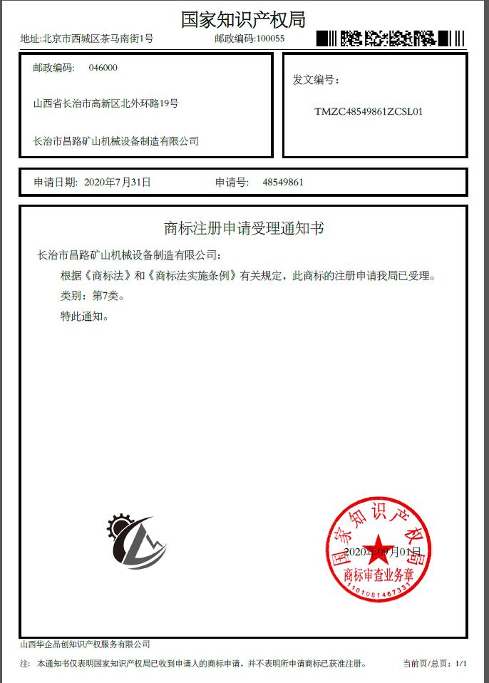 商標注冊申請受理通知書